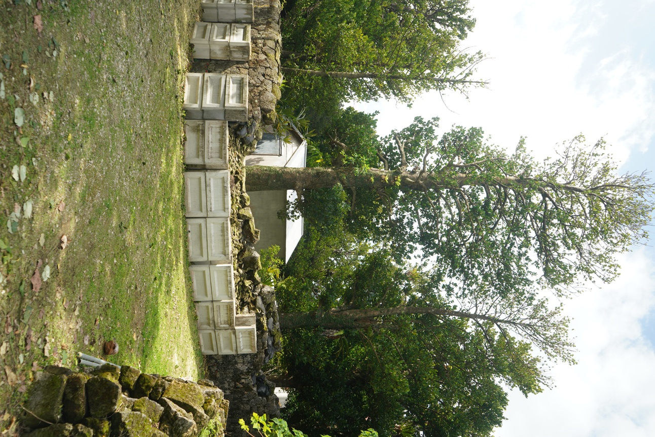 今年度の整備では、東江御殿の石垣の北側から北東部の解体工事と、石垣の根石(※1)の状態を確認するための発掘調査と、今回の石垣解体工事箇所に接近しているフクギの根切りを行います。整備箇所は、内間御殿の正面の大きなサガリバナの脇の正面入口から入り、東江御殿の神殿まで行くと、神殿の右側から整備工事の様子を覗くことができます。