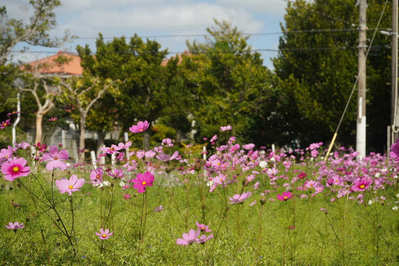 内間御殿見学の際は、駐車場がありませんので、公共交通機関をご利用ください。内間御殿にお越しの際は、内間御殿向かいのコスモス畑もご覧になられてはいかがでしょうか。いま、コスモスが満開に咲き誇っています。