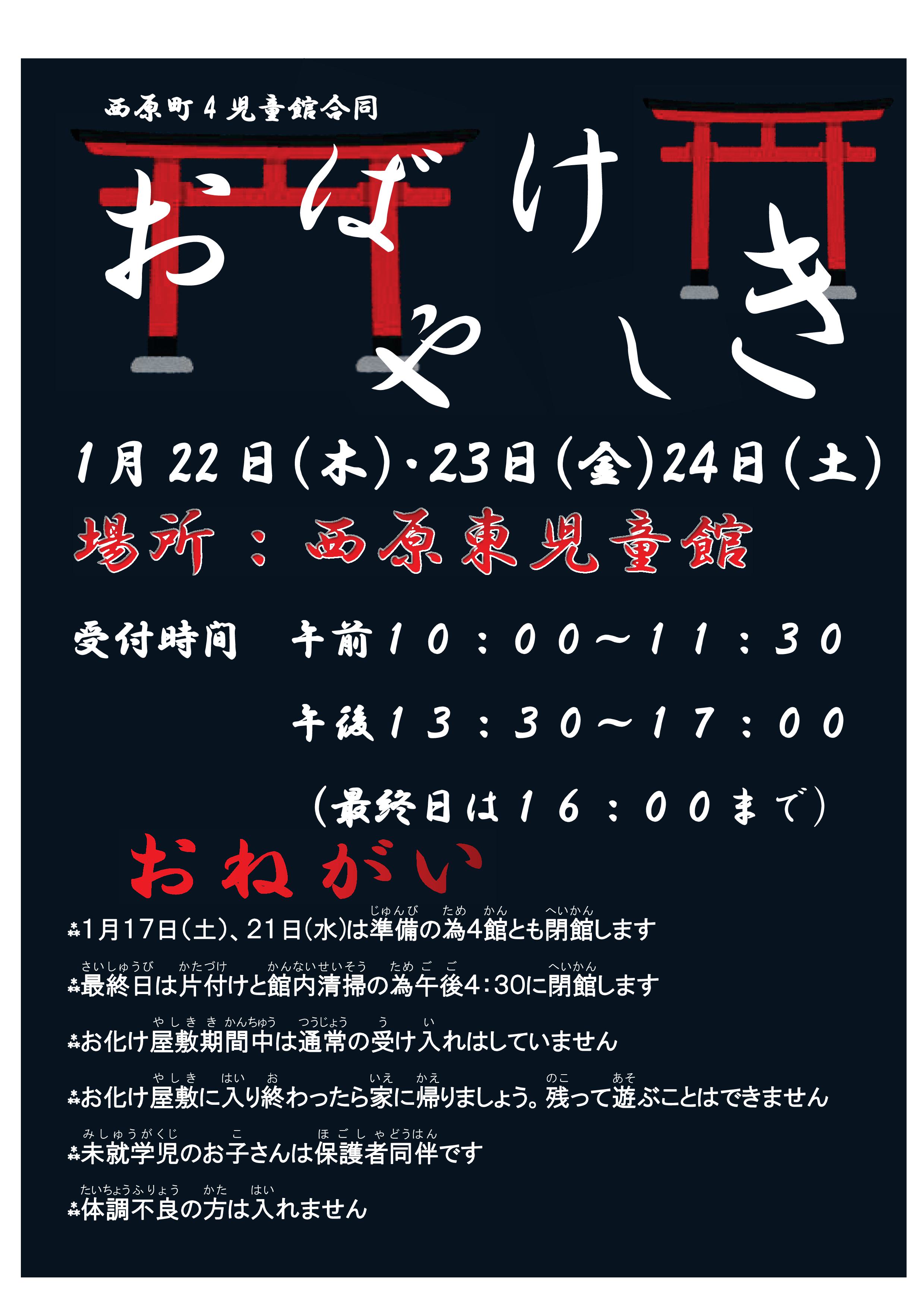 ・1月24日(土)はイベント対応のため、西原東児童館以外の3児童館を閉館とさせていただきます。